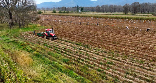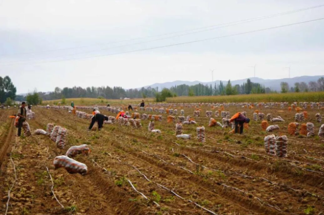 機(jī)械的轟鳴聲奏響了豐收的序曲。大型土豆收獲機(jī)正開足馬力,在田壟間勻速前行。隨著犁刀深入土壤,一壟壟飽滿、鮮嫩的土豆如同破土而出的“金豆豆”,在陽光下閃爍著誘人的光澤,被翻犁到地表,整齊地鋪排在田間。村民們緊隨其后撿拾土豆,他們頭戴遮陽帽,分散在剛剛犁過的土地上,動作嫻熟地將一個個土豆撿起,輕輕抖落附著的泥土,再麻利地裝入身邊的編織袋中。大家有說有笑,雖然額頭上沁出汗珠,但臉上卻難掩喜悅。不一會兒,一個個鼓囊囊的袋子便整齊地排列在田埂上,等待著裝車運(yùn)輸。