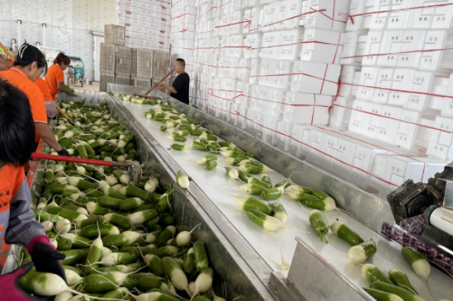 在水果蘿卜種植基地,村民們將蘿卜分揀裝筐,隨即轉(zhuǎn)運至村里的臨時操作間。操作間內(nèi),分揀、清洗、裝箱、貼標(biāo)等工序有條不紊,打包好的蘿卜當(dāng)天便通過冷鏈物流發(fā)往全國各地,不僅走進(jìn)了菜市場和連鎖商超,更能快遞到“家門口”,讓本地及周邊消費者第一時間嘗到新鮮。